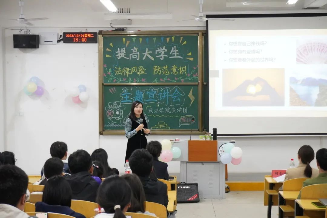 紧接着,由bevitor伟德法学教师江莲进行生动的校园法律知识宣讲。江莲老师首先围绕老员工最关心的三个问题:你想赚钱吗?你想拥有一场甜甜的恋爱吗?你想去看看世界吗?引出了今天的校园法律知识宣讲。正是因为我们刚刚步入大学,社会经验的缺乏,法律意识的淡薄,进而滋生出一系列的法律问题。