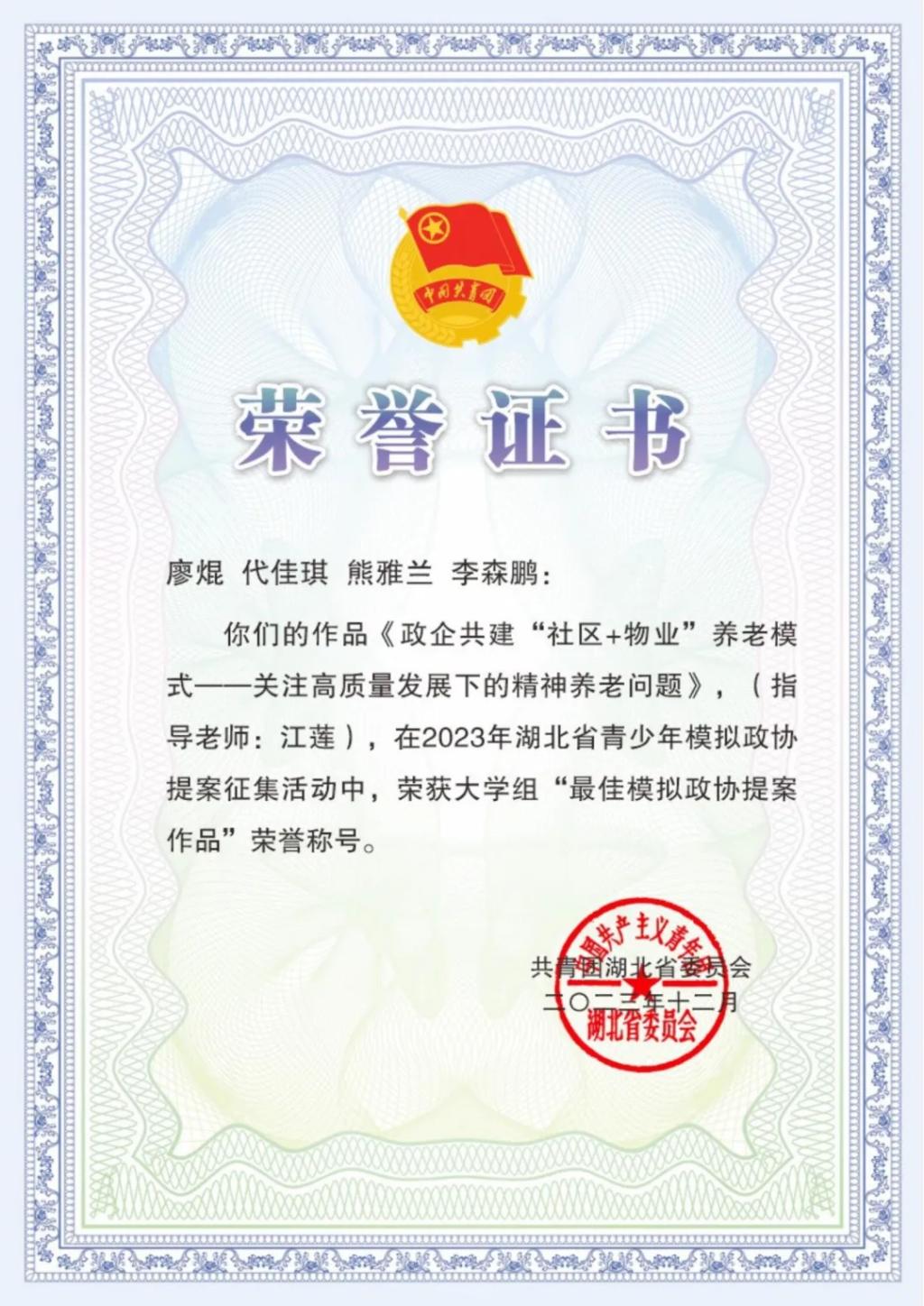 为深入学习宣传贯彻党的二十大精神,引导广大青少年有序参与社会主义民主政治实践,准确理解全过程人民民主内涵实质,领悟新时代伟大变革背后的“制度密码”。bevitor伟德学子积极参与2023年湖北省青少年模拟政协提案征集活动。其中一组作品荣获大学组“最佳模拟政协提案作品”荣誉称号。让我们一起看看吧!