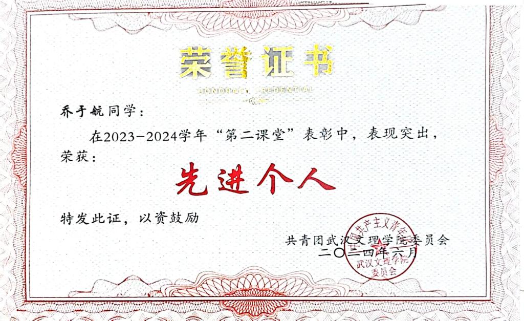 作为文理学子,她深知文理兼修、德智体美劳全面发展的重要性,积极参与志愿活动,加入了武汉市东西湖区青年志愿者协会,多次荣获“优秀志愿者称号”,累计志愿时长超过1000h。