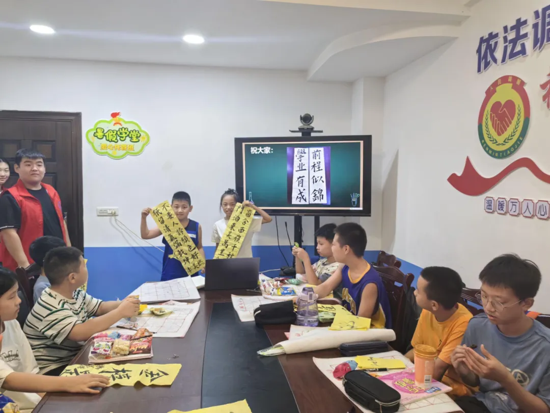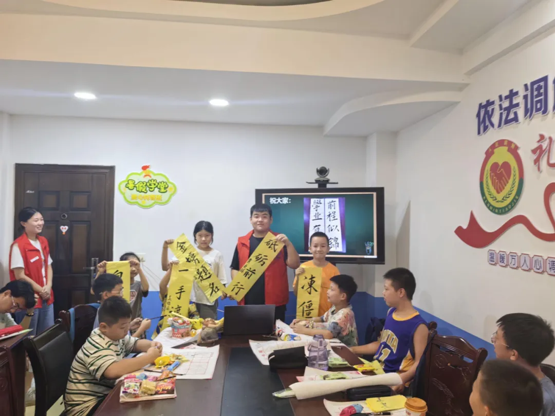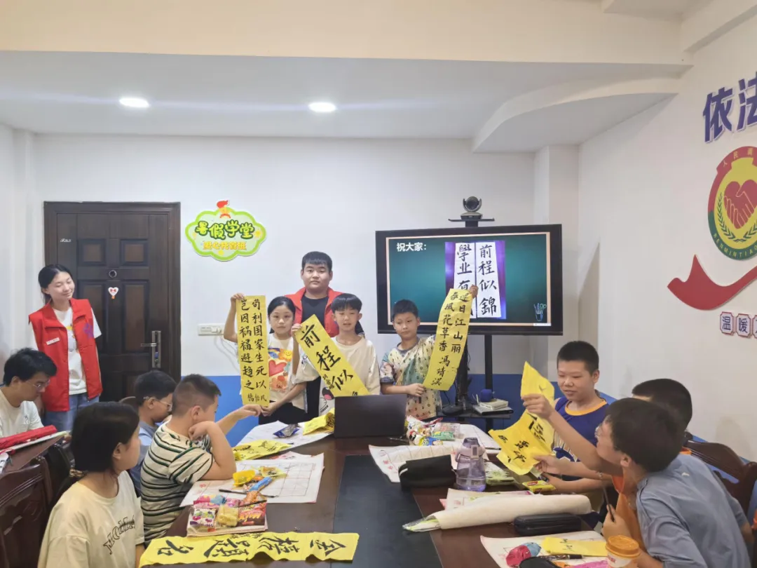 最后,志愿者吴睿伊应各位小朋友的要求,为每一位小朋友都留下了一幅“墨宝”。一个个成语、一句句诗词,不仅是小朋友们对自己未来生活的向往,也是志愿者老师们对他们的期望。