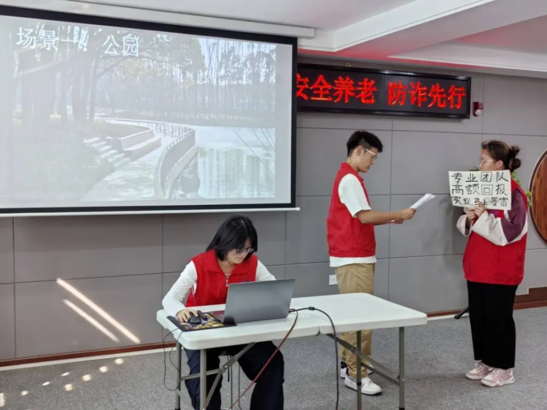随后,志愿者们上演了一场精彩的反诈情景剧——《马上暴富》,通过生动形象的表演让老年人们更加直观的了解诈骗的危害和防范的重要性。活动最后,志愿者们还将贴有反诈标语的小礼品,送给此次参加宣讲会的老年人,也希望老年人们提高防范意识。