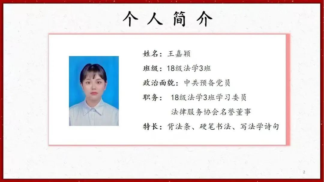 宣讲内容:王嘉颖学姐不仅专业成绩优异,而且在课堂上十分活跃,平时分遥遥领先。她有着丰富的比赛经验,生活中利用专业知识帮助他人解决问题。学姐不仅化解了同学们沉重的学习压力,还激励法学同学向着美好未来。乐观积极阳光向上是她带给我们最好的印象!