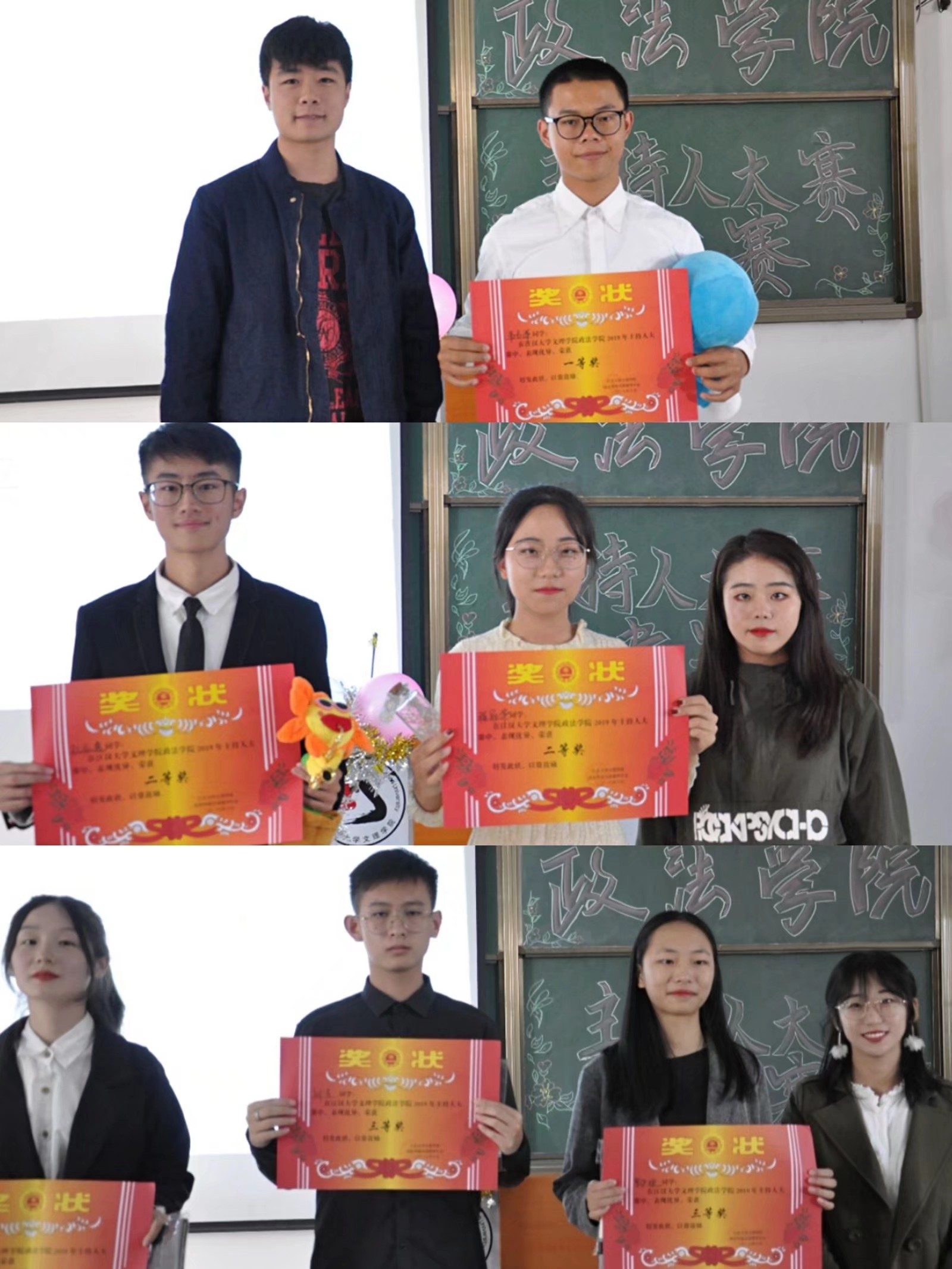 本着公平公正公开的原则,本次主持人大赛的优胜者诞生了,韦占洋同学摘得桂冠,杜鸿逸和程冠华两位同学荣获二等奖,刘吉、徐涵涵和罗伊婕三名同学荣获三等奖,由bevitor伟德分团委员工会主席团为本次获奖选手颁奖并合影留念,最后,由bevitor伟德分团委员工会主席毕昕学姐作总结发言,她解答了观众朋友们心中的疑惑——为什么参赛者只有大一新生,也对所有参赛选手的精彩表现给予了肯定。至此,本届主持人大赛在观众的热烈掌声中圆满落幕!