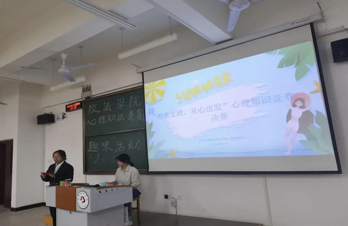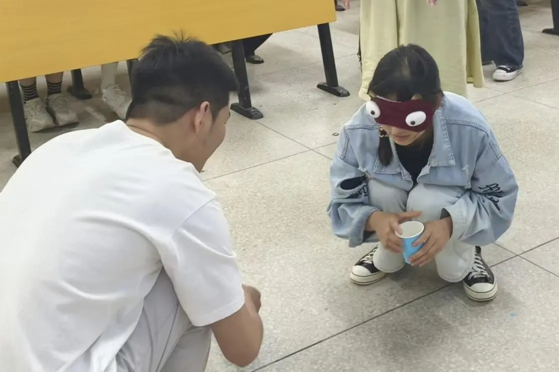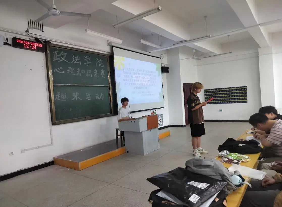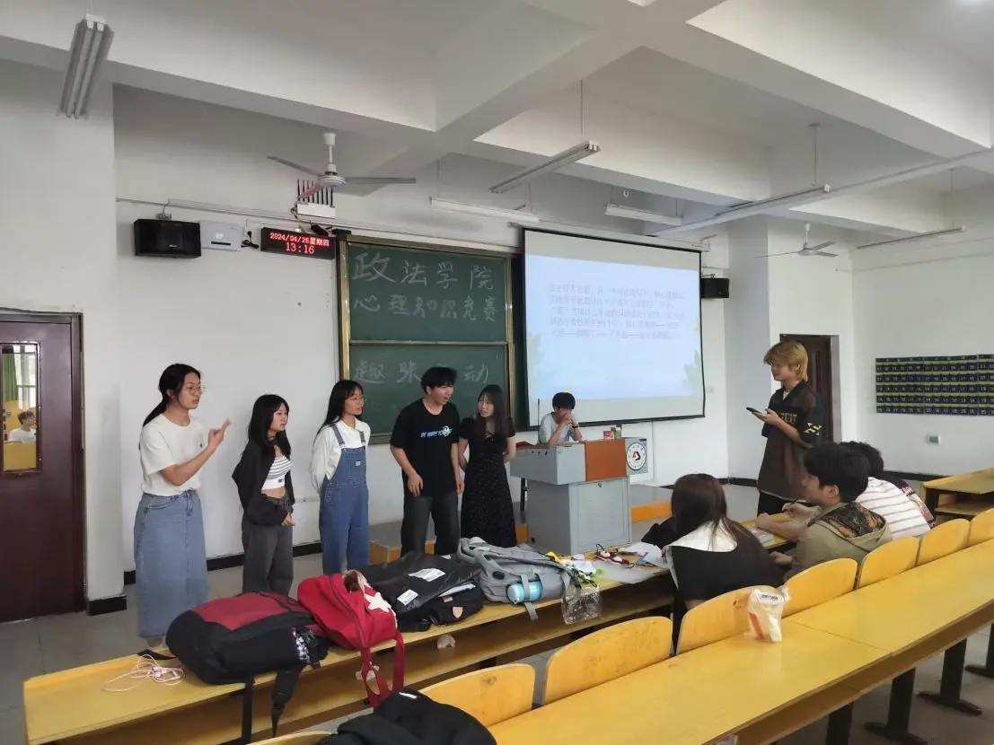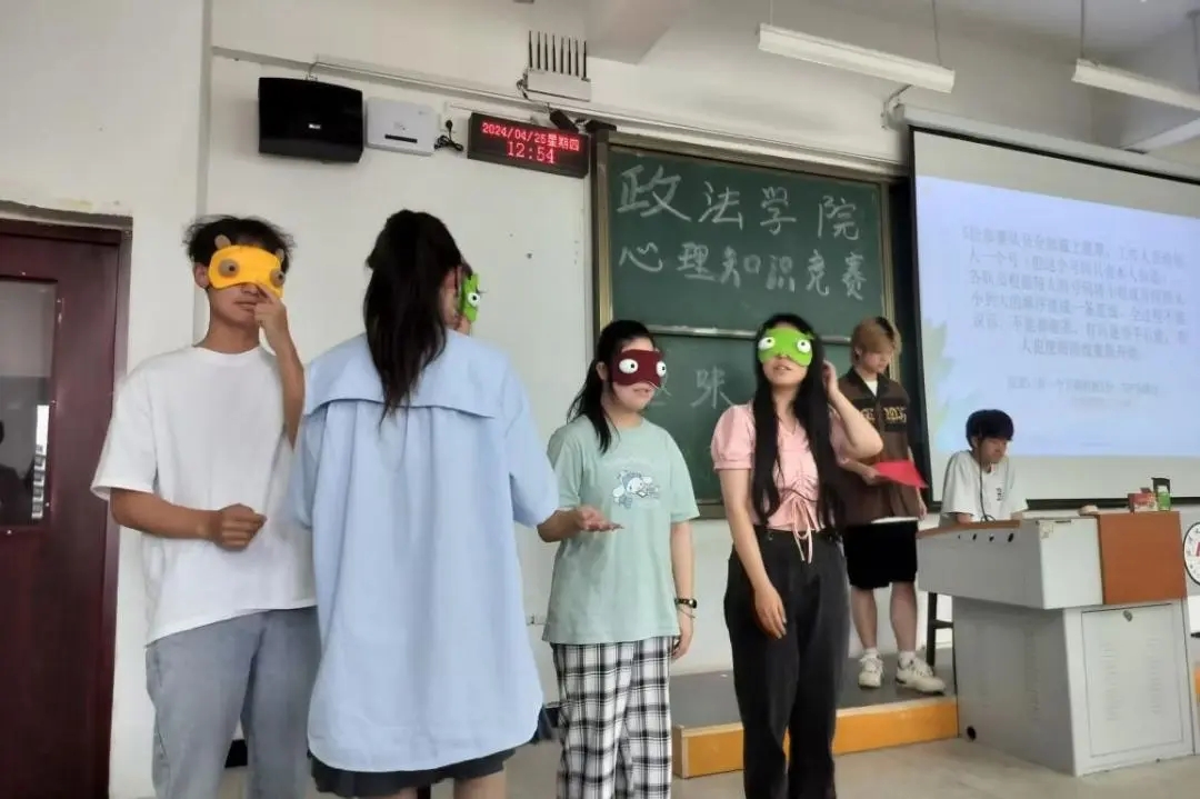 2024年4月25日中午,在教学楼5-123和5-124开展决赛心理趣味小游戏。政法心协精心准备了五个游戏,有“蒙眼取水”、“盲人摸号”、“记忆考验”、“你划我猜”、“乱词接龙”。首先由各个队伍的队长通过抽签的方式随机抽取两个游戏,在每个游戏开始前,再对抽取到这个游戏的队伍的比赛顺序进行抽签,各队伍按顺序上场进行比赛,并对游戏进行计时,采取积分制。