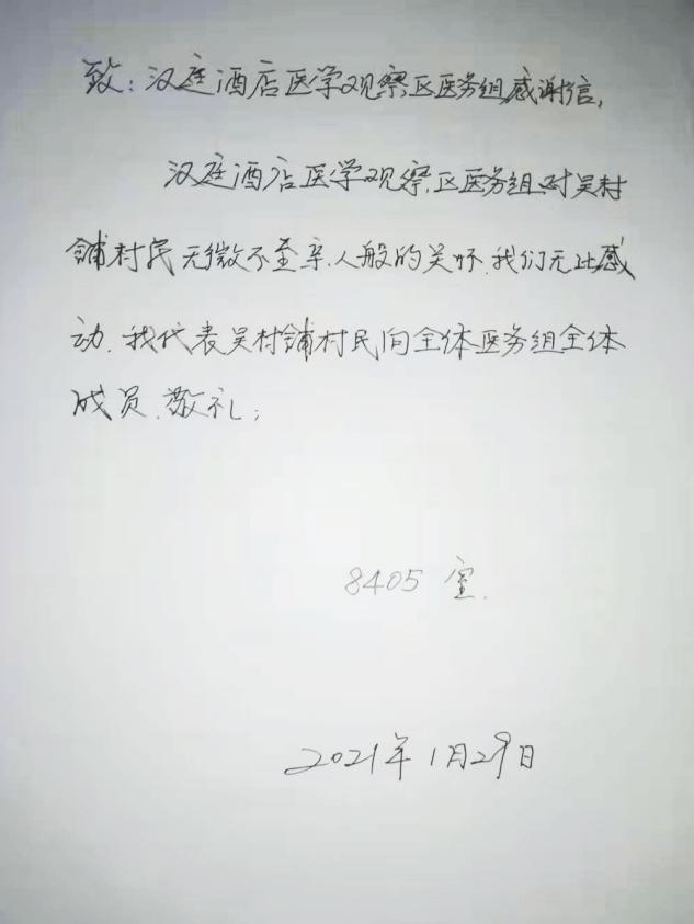 虽然这份工作只有短短的一个月,但脑海中的回忆扔在蔓延,令许笑扬印象最深的是有一位七十多岁的老太太,很认真地听她说话,又很慈祥的一直在感谢她,当时她就觉得心里就暖洋洋的。还有一位隔离人员亲自手写了一封感谢信,后来又发了电子版的感谢信,这让他们这些志愿者们都很感动。这是大家对她的认可与肯定,这段短暂的经历,已经转化为一笔无形的财富。