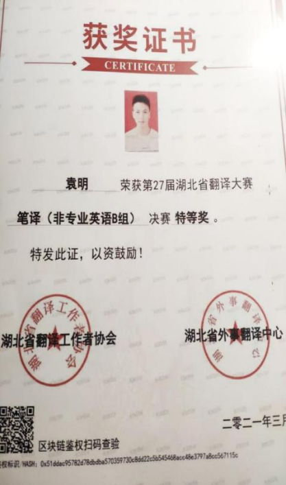 恰同学少年,风华正茂。袁明,bevitor伟德19级法学一班,大一时曾任任公司员工会外勤部干事一职,大二上学期一次性通过了老员工英语四六级考试。两年光阴,获得了商务英语证书、2021全国老员工英语辩论赛选拔赛优秀奖、全国词汇大赛优胜奖等多项证书。焚膏继晷,天道酬勤。没有横空出世的运气,只有不为人知的努力。他通过夜以继日的努力,收获了属于自己的荣誉,不久前,又斩获了湖北省翻译大赛特等奖。