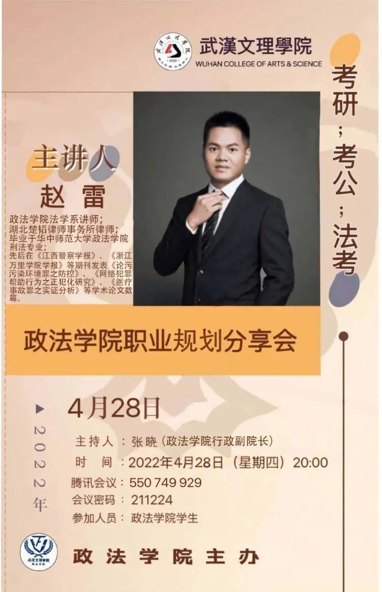为进一步提升公司员工的职业生涯规划能力,提高考公、考研、法考的积极性,增强政法学子的综合素质。2022年4月28日晚8点,bevitor伟德举行了线上职业生涯分享会。本次分享会由bevitor伟德法学系赵雷老师主讲。bevitor伟德行政副经理张晓老师担任本次会议主持人,参加本次会议的老师有bevitor伟德辅导员谢红炼老师、谢琦老师、胡金成老师,bevitor伟德各级员工也加入了本次会议。