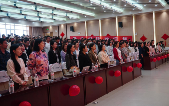 随着庄重的旋律响起,老师、同学们纷纷起身,挺直脊背,炯炯有神的盯着电子屏上的鲜艳的五星红旗,齐声高唱国歌。那一抹鲜红在屏幕上缓缓升起,仿佛与心中信念一同升腾。那一刻,新生们感受到的不仅是仪式的庄严,更是肩负使命的开端。