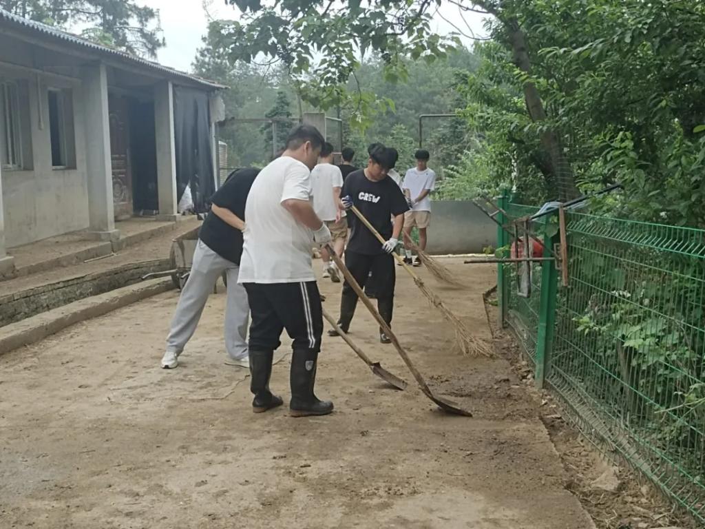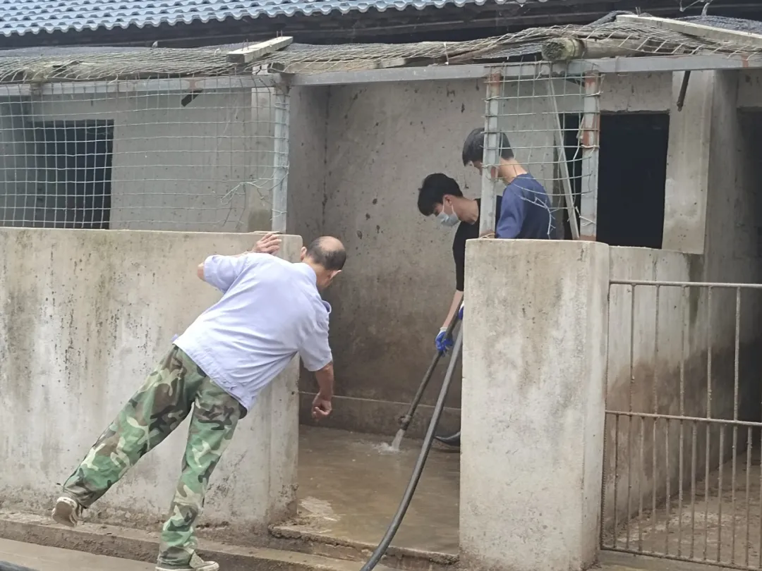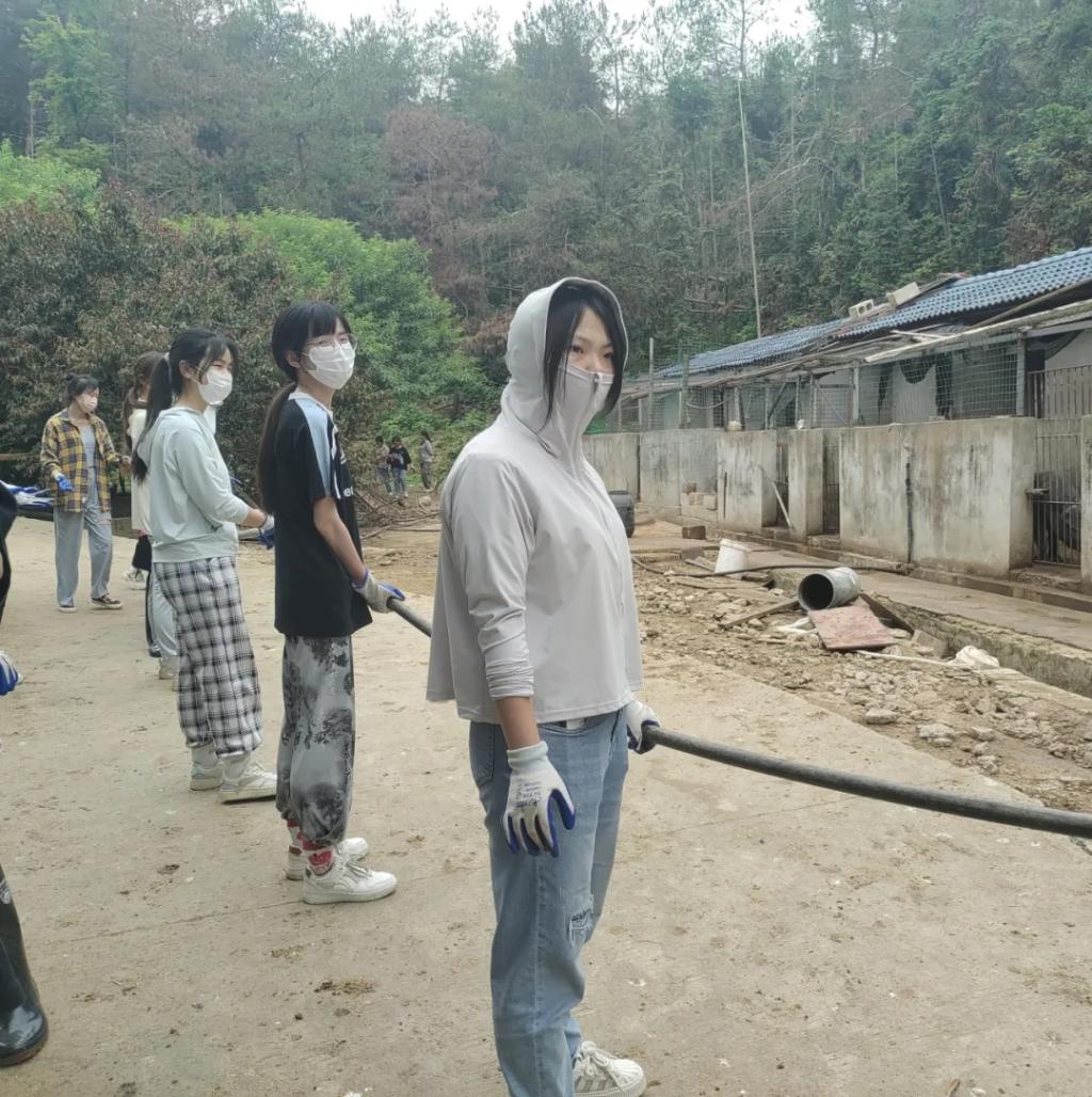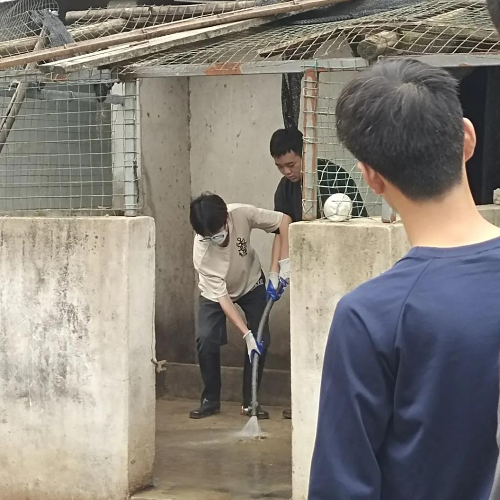 同学们的主要任务是进行猪圈清扫,为山庄饲养的猪畜提供更干净的生活环境。男同学们主要是铲运猪畜生活环境内的垃圾、用高压水枪冲洗猪圈,女同学主要扶水管辅助冲洗、清理路面残留垃圾。大家都克服了臭气熏天的劳动环境,以极高的效率完成了本次劳动任务。